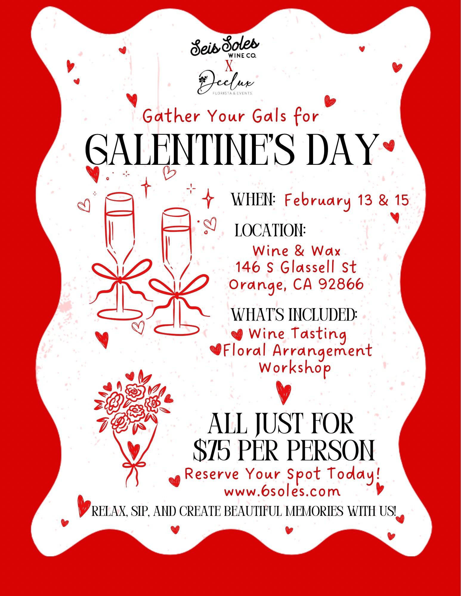 Join us for an unforgettable Galentine’s experience filled with wine, flowers, and beautiful memories.